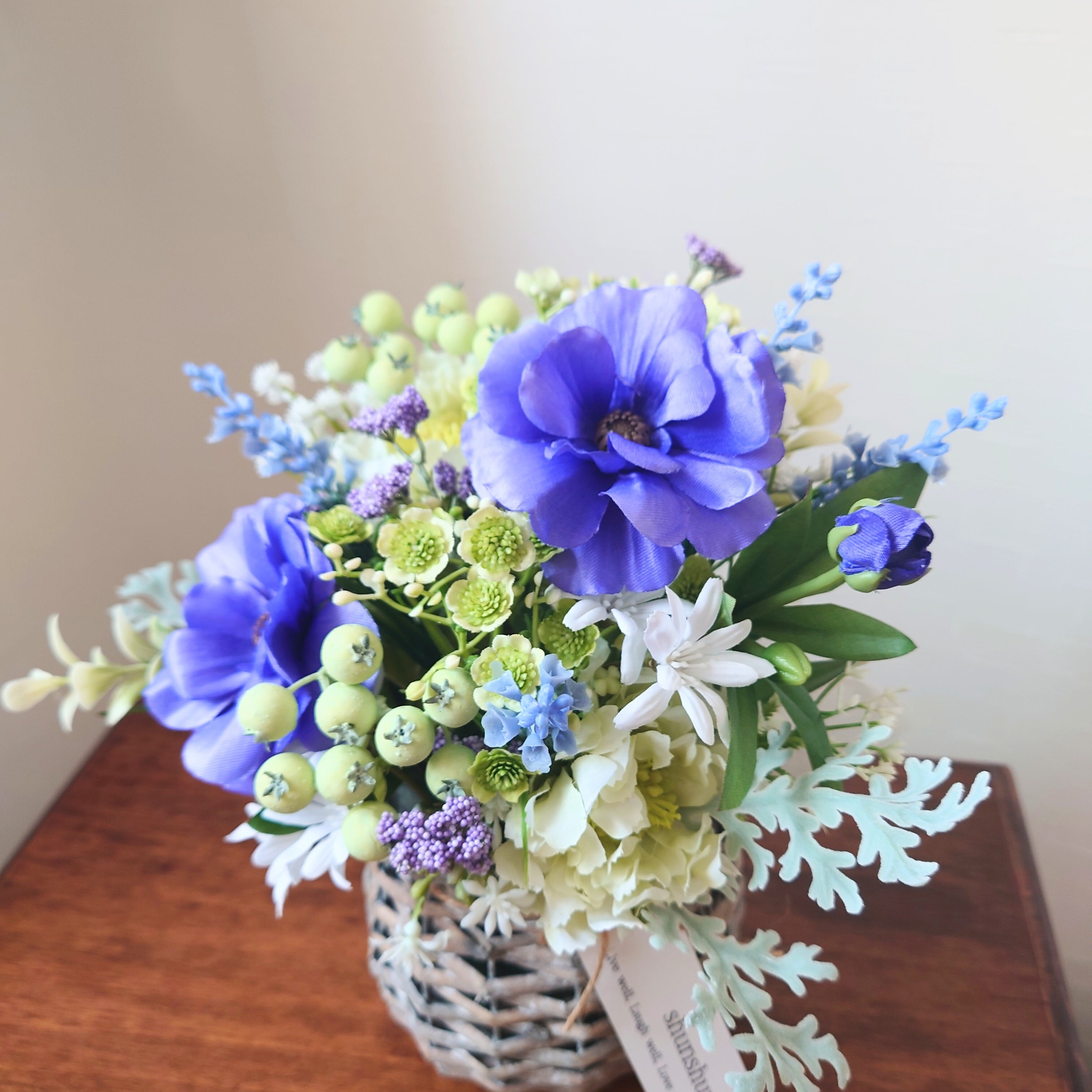 バスケットの花器が素朴で温かみがあり、玄関やリビング、デスクなど、どんな場所にも自然になじみます。