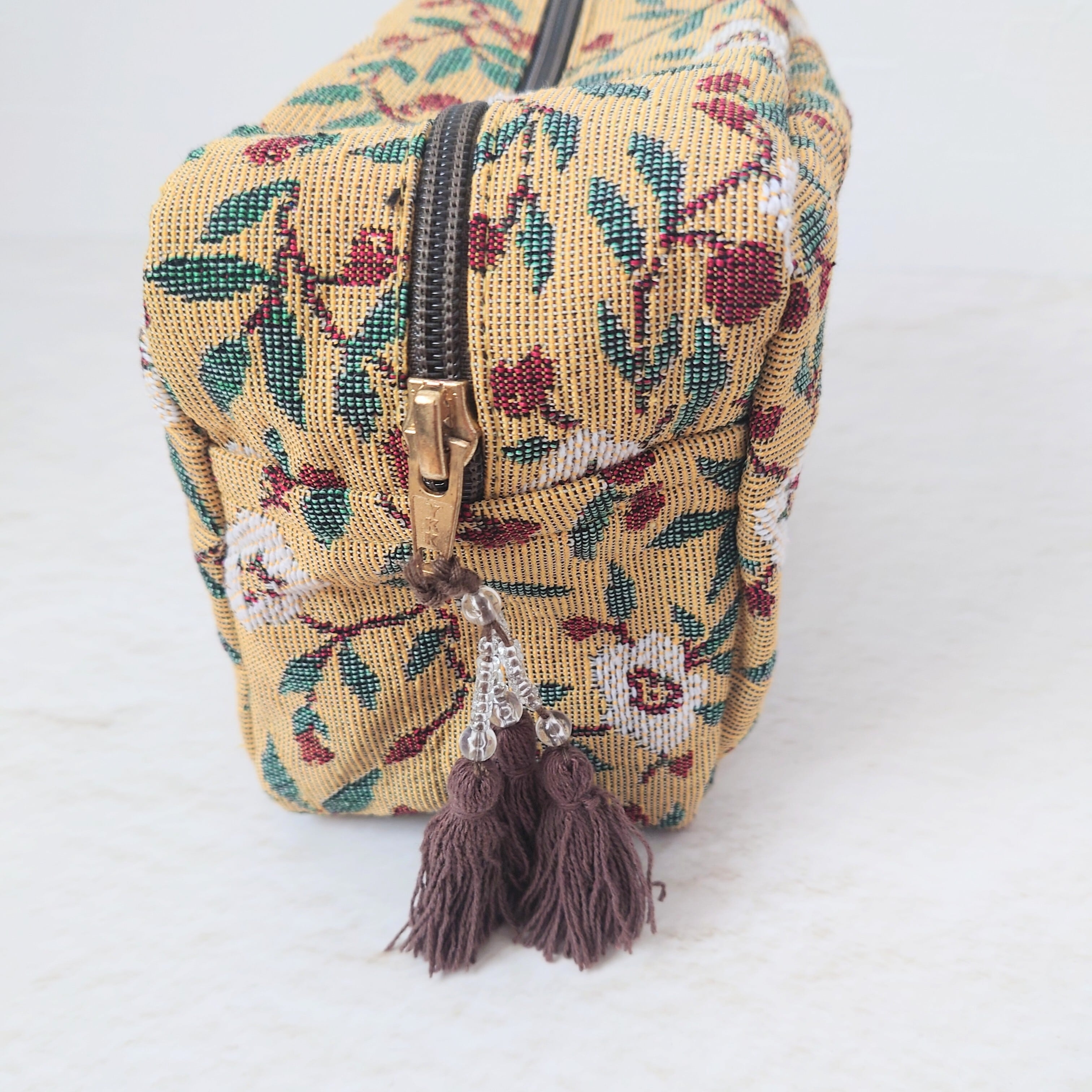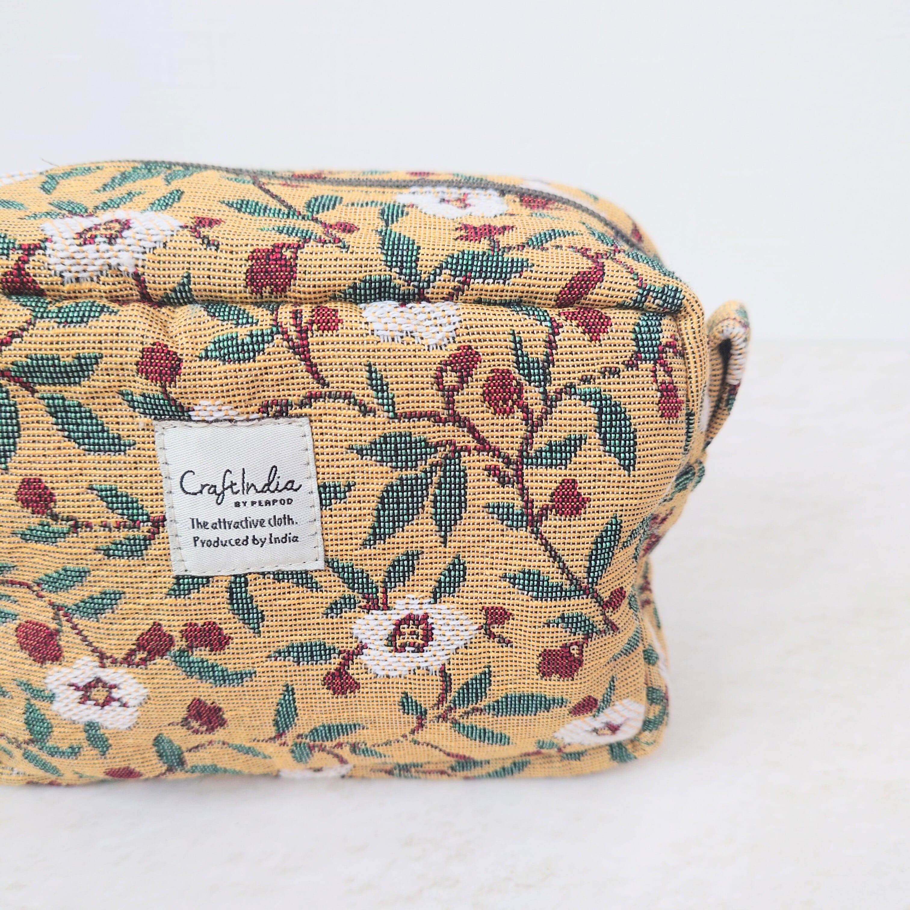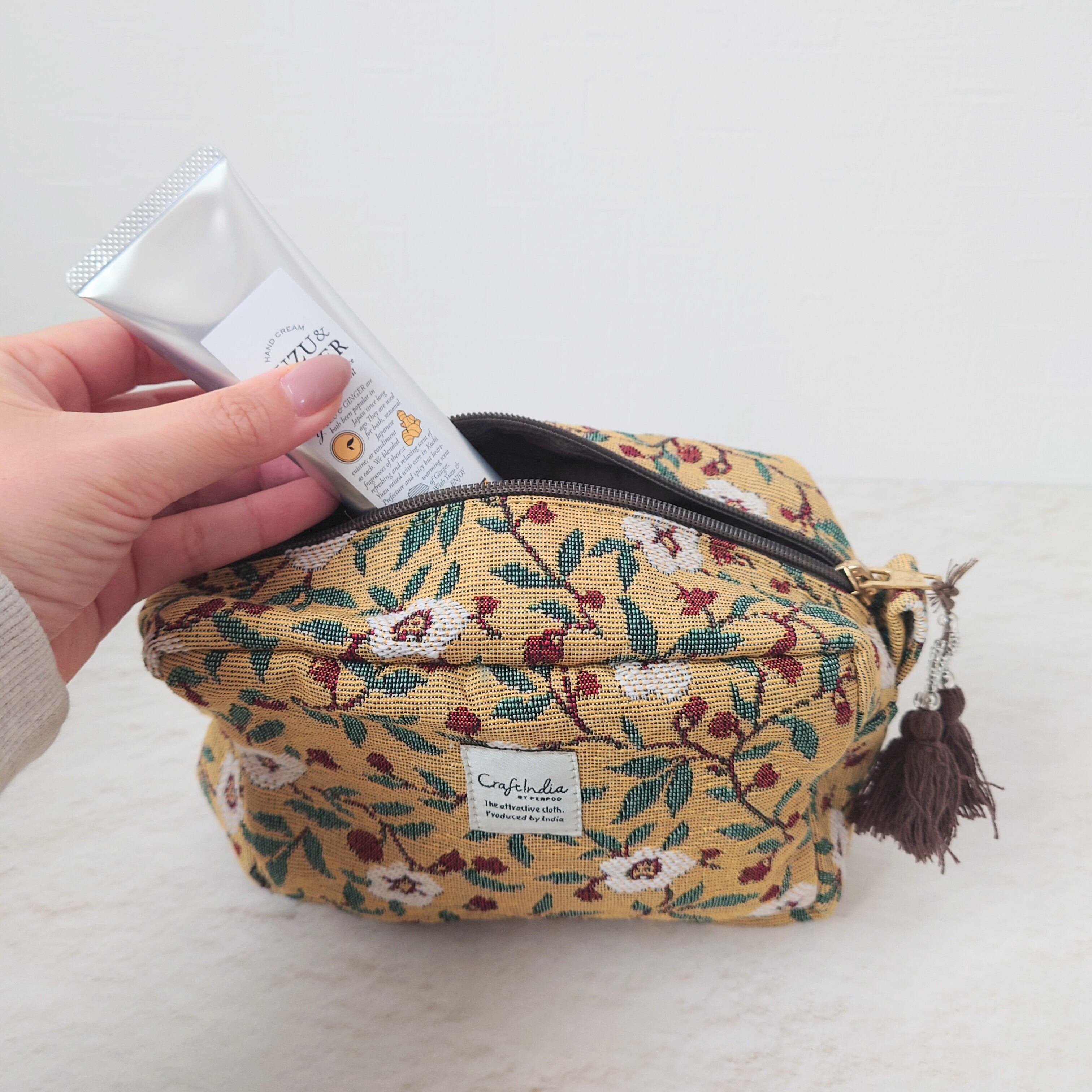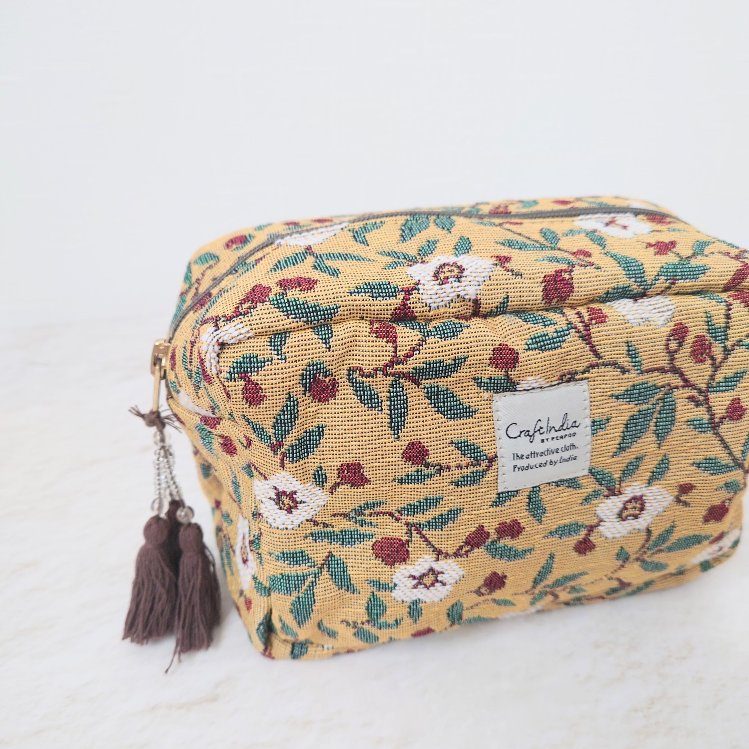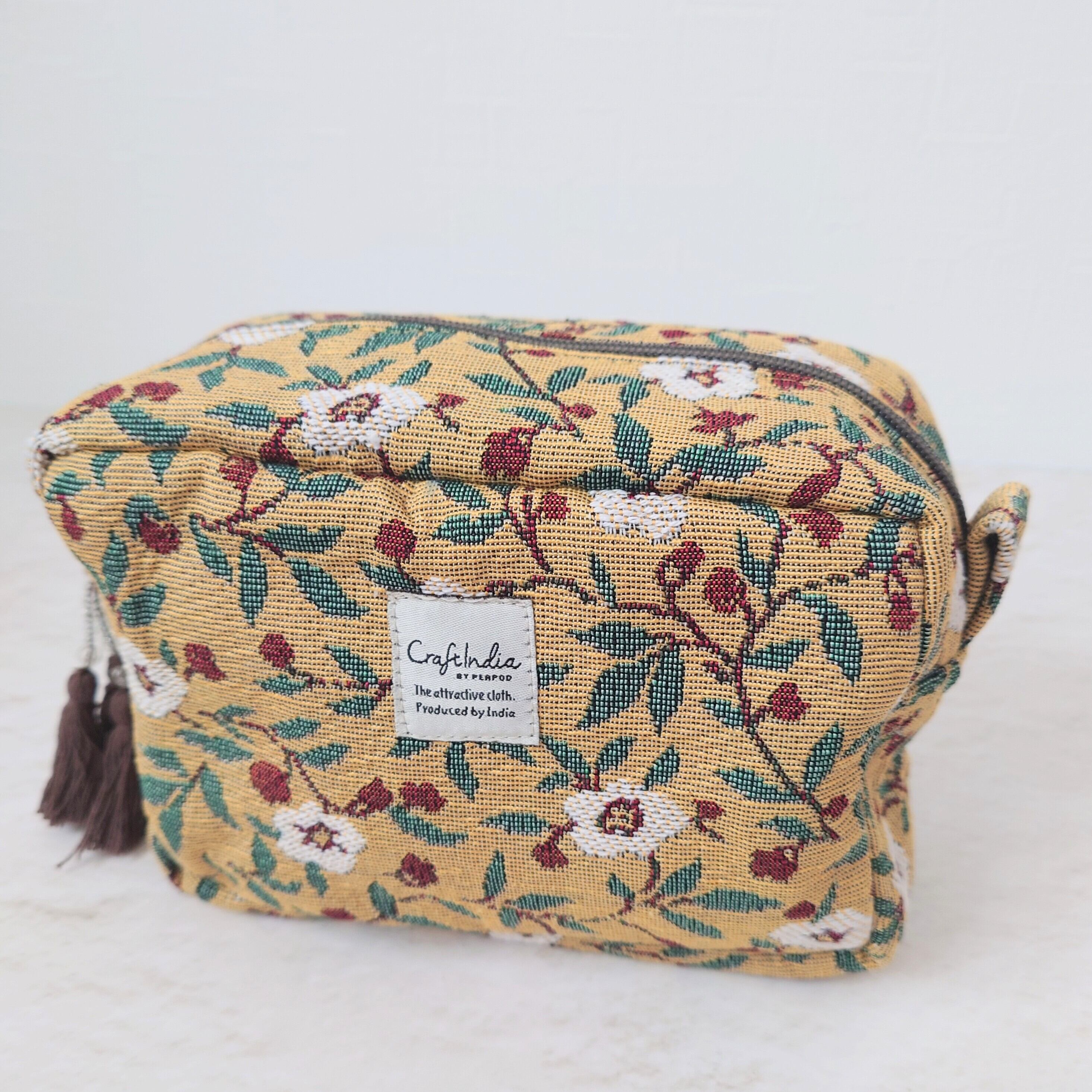 陽だまりのようなイエローカラーに、蔦をのばす白い花が印象的なジャカード織りのポーチ。