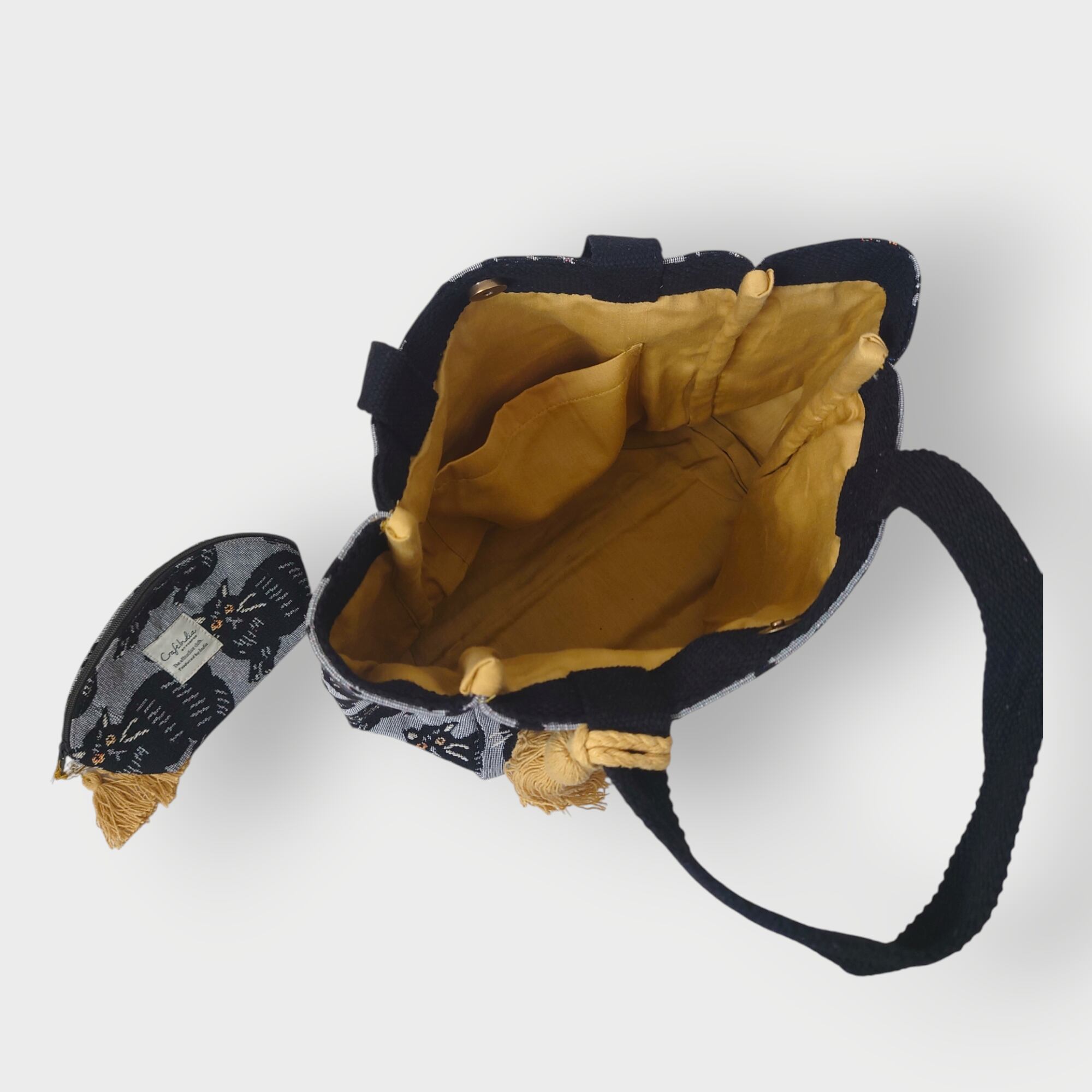 トートバッグの持ち手には、アクセントになる深みのあるイエローのタッセルを添え、裏地にも同じカラーが使用されています。