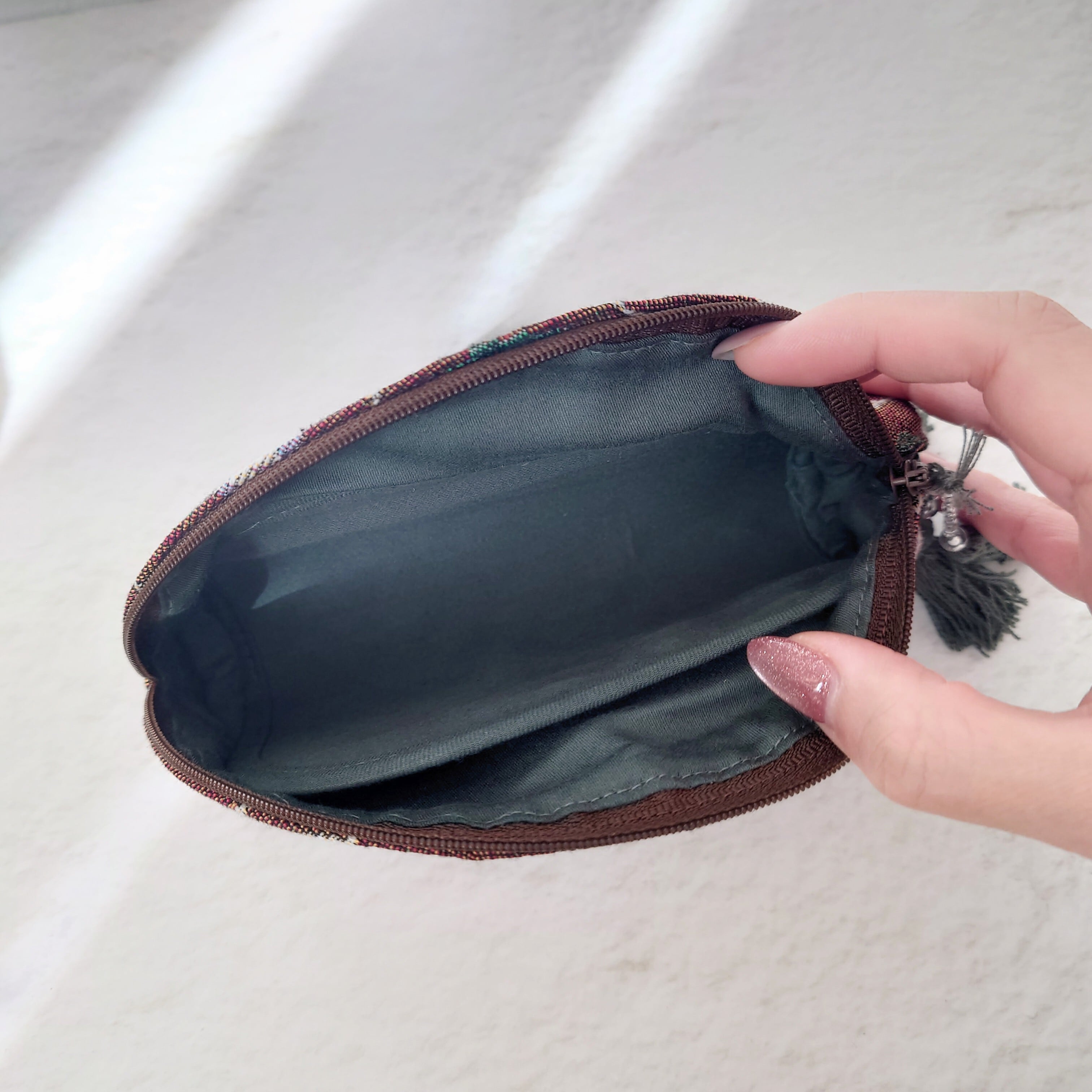 チャック部分にはアクセントになるタッセルを添え、裏地はそのカラーに合わせてあります。