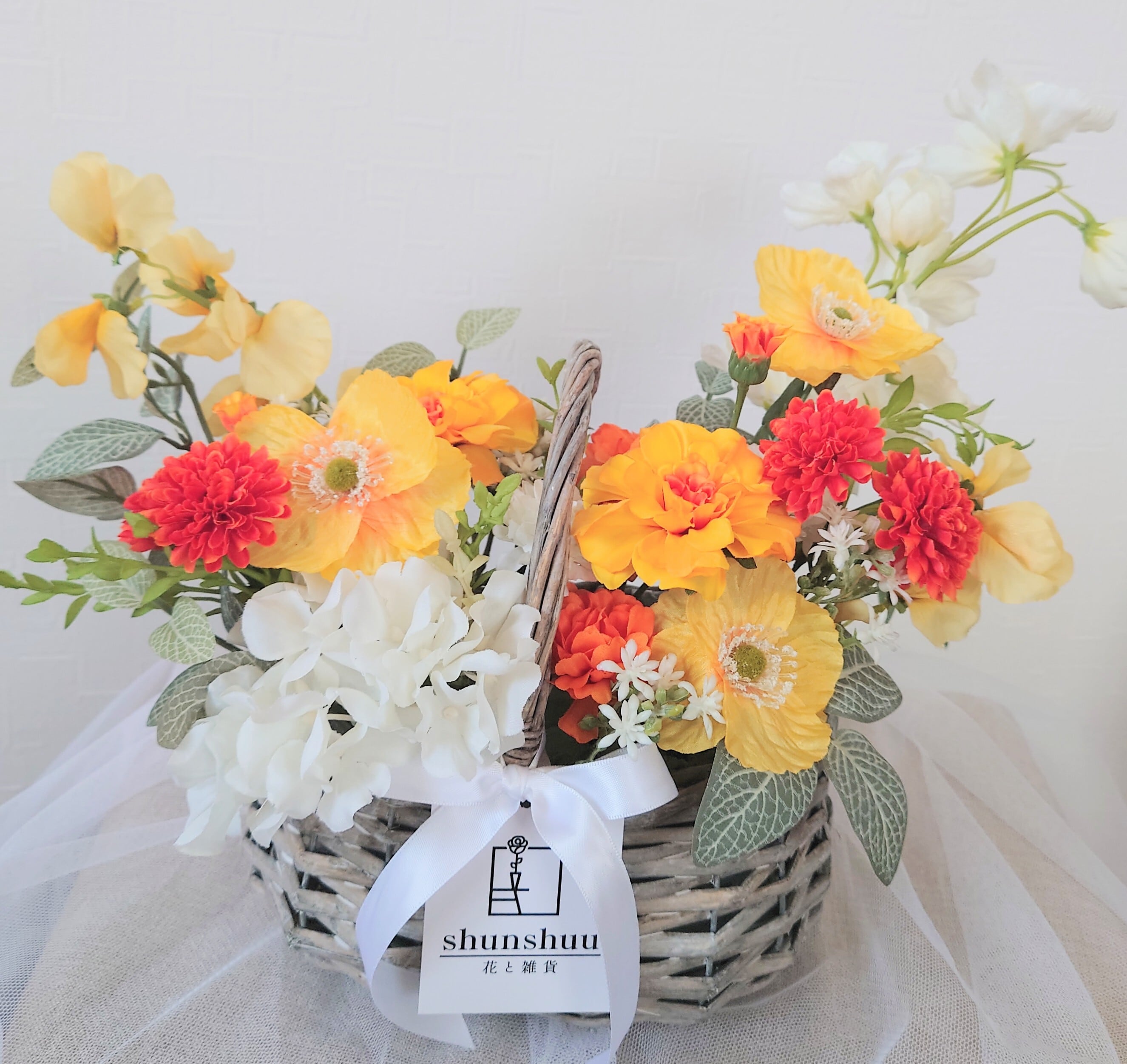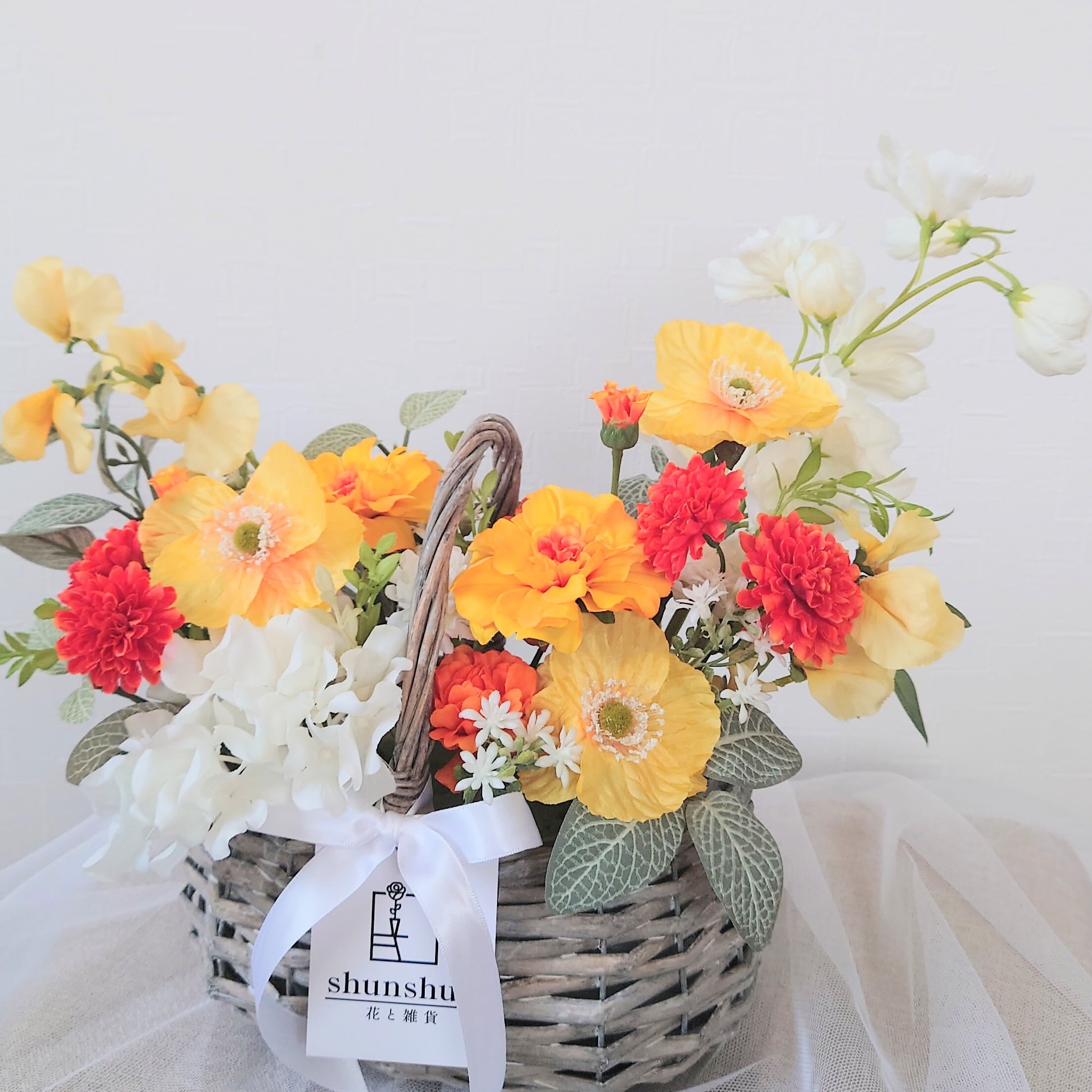 明るい色合いのポピーとマリーゴールドに、軽やかに舞う黄色のスイートピーを添えたバスケットアレンジメント。