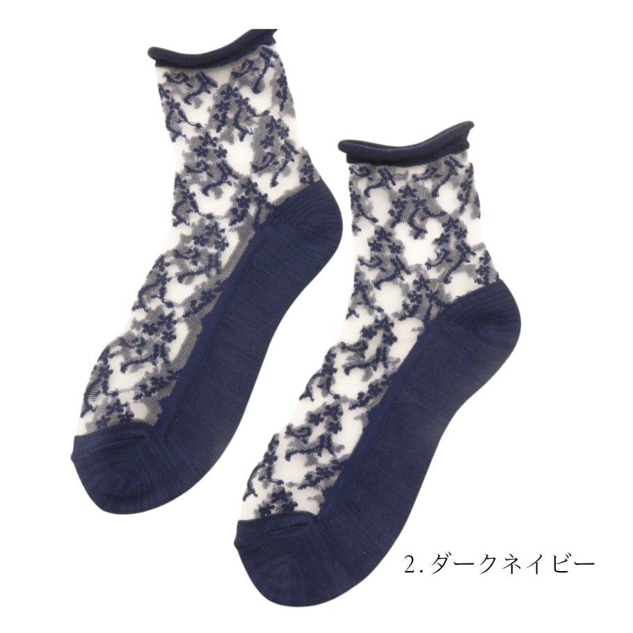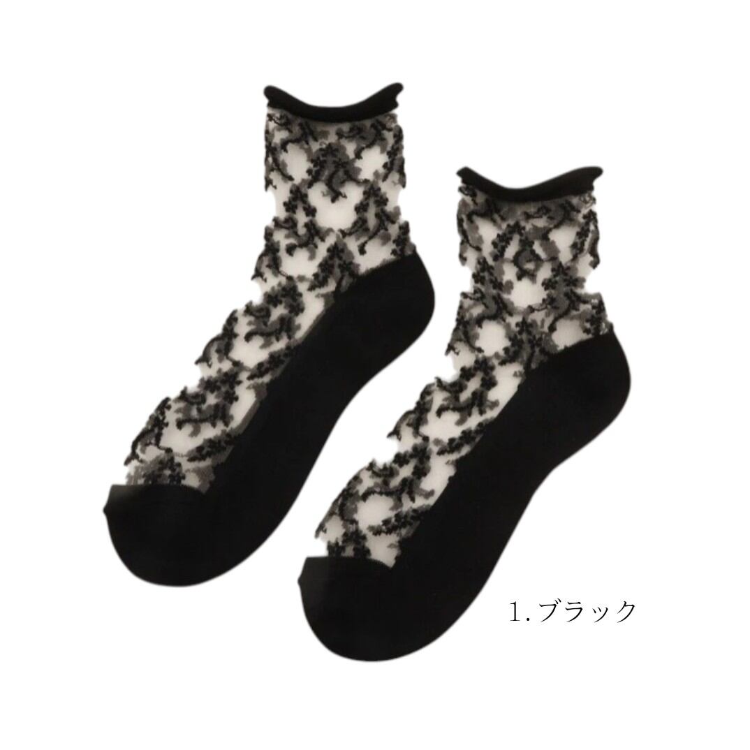 透け感のある軽やかな素材に、クラシカルな柄がふんわりと浮かび上がり、足元にさりげない華やかさを添えてくれます。