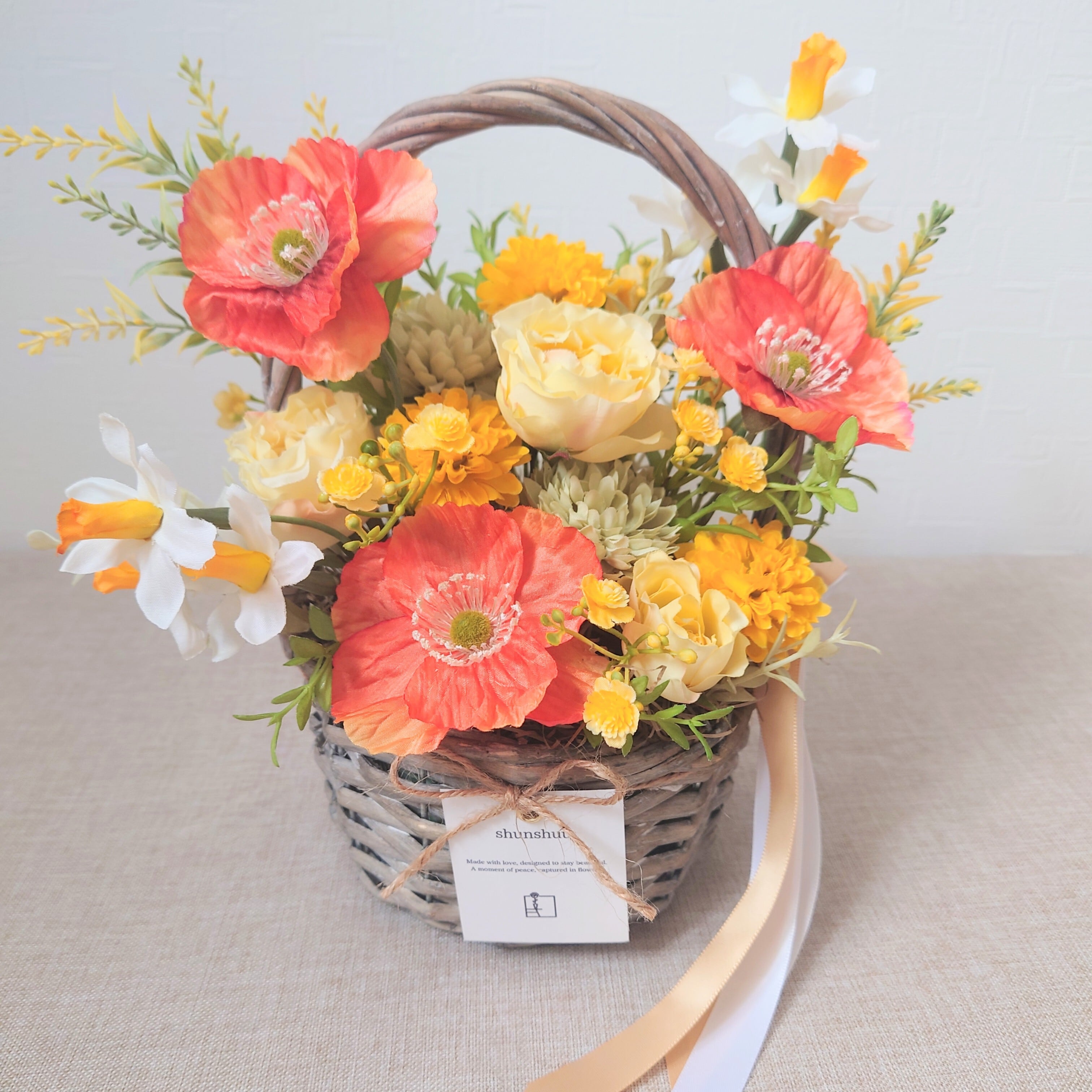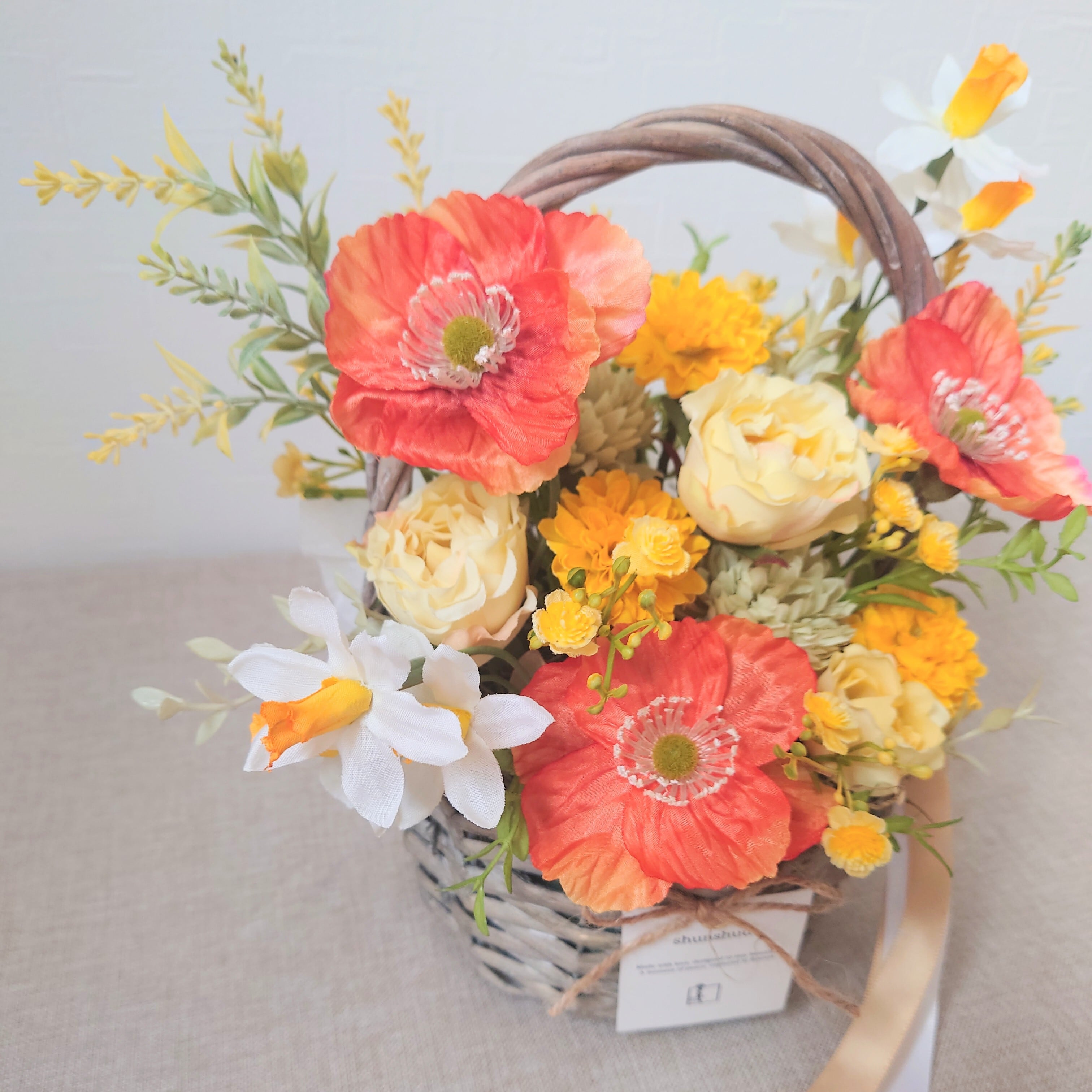 ポピーとスイセンのバスケットアレンジ