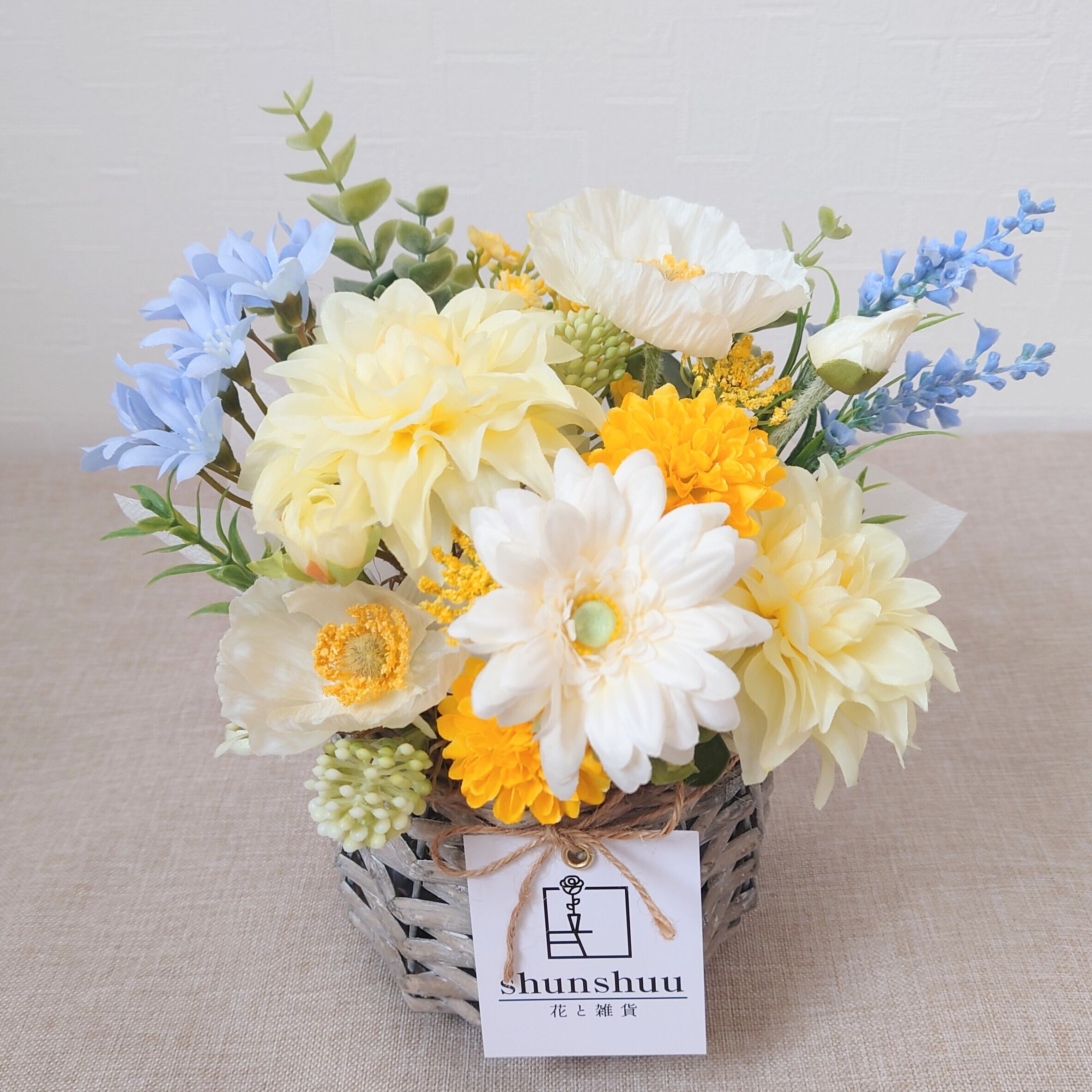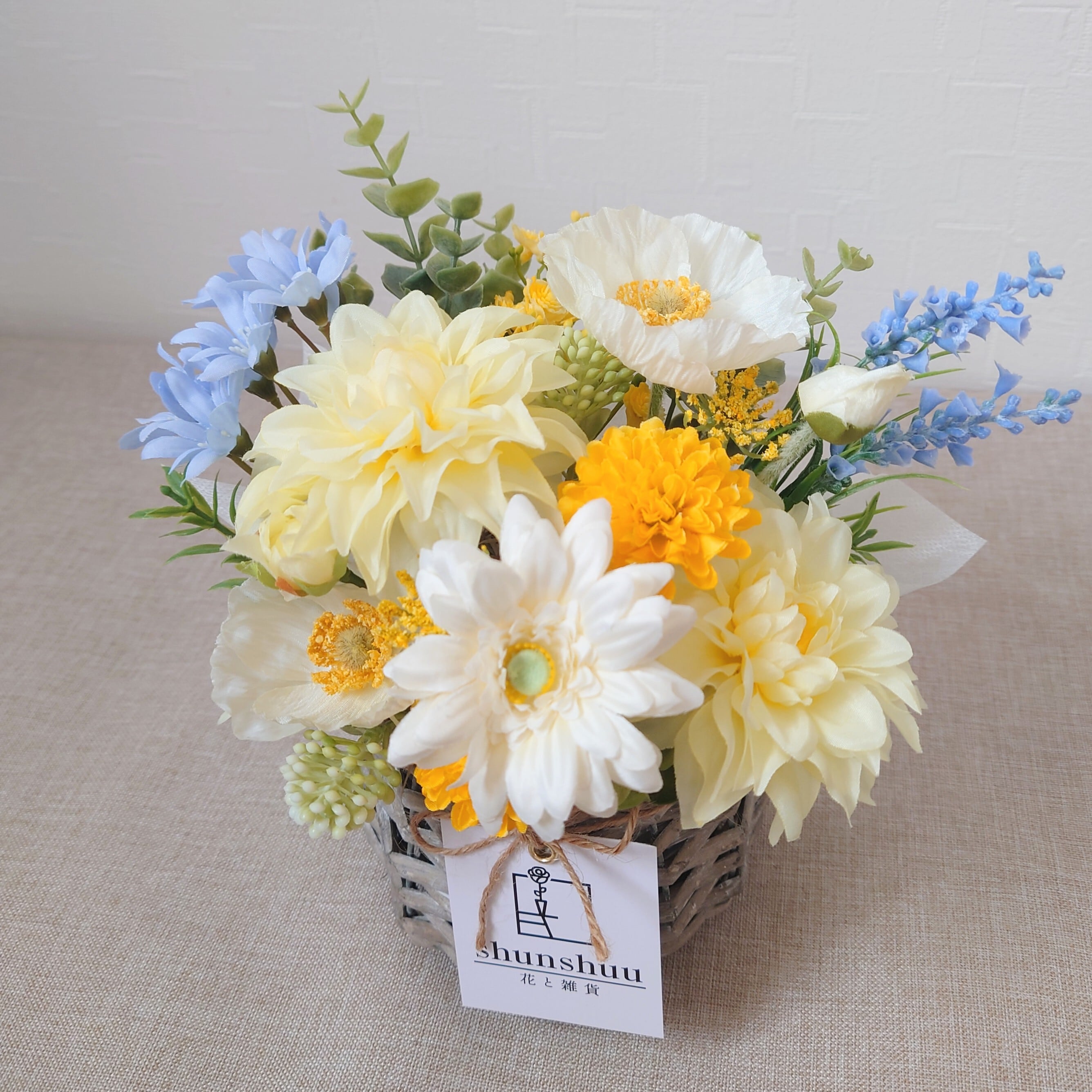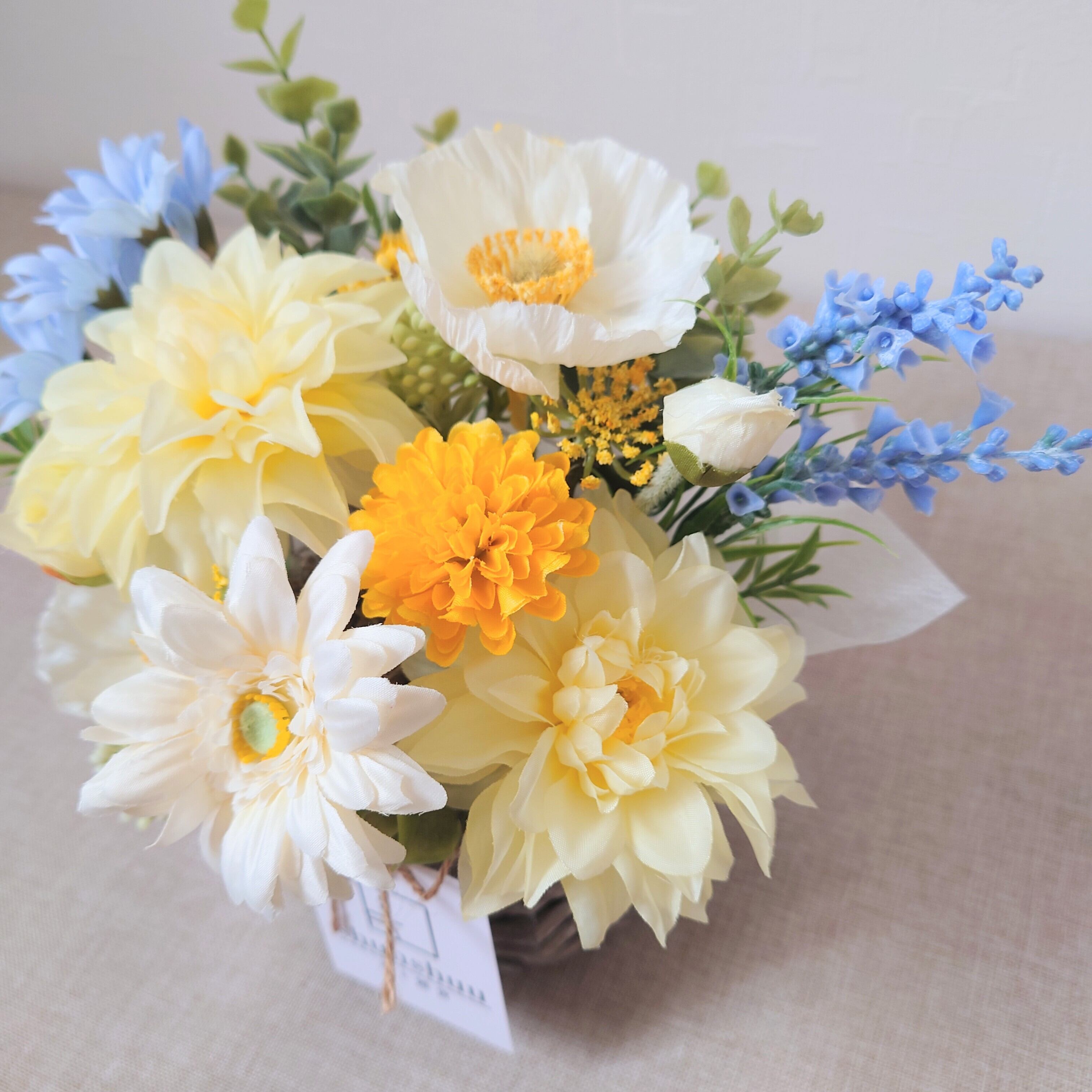 やわらかな陽ざしに包まれたような、明るく穏やかな色合いのフラワーアレンジメント。