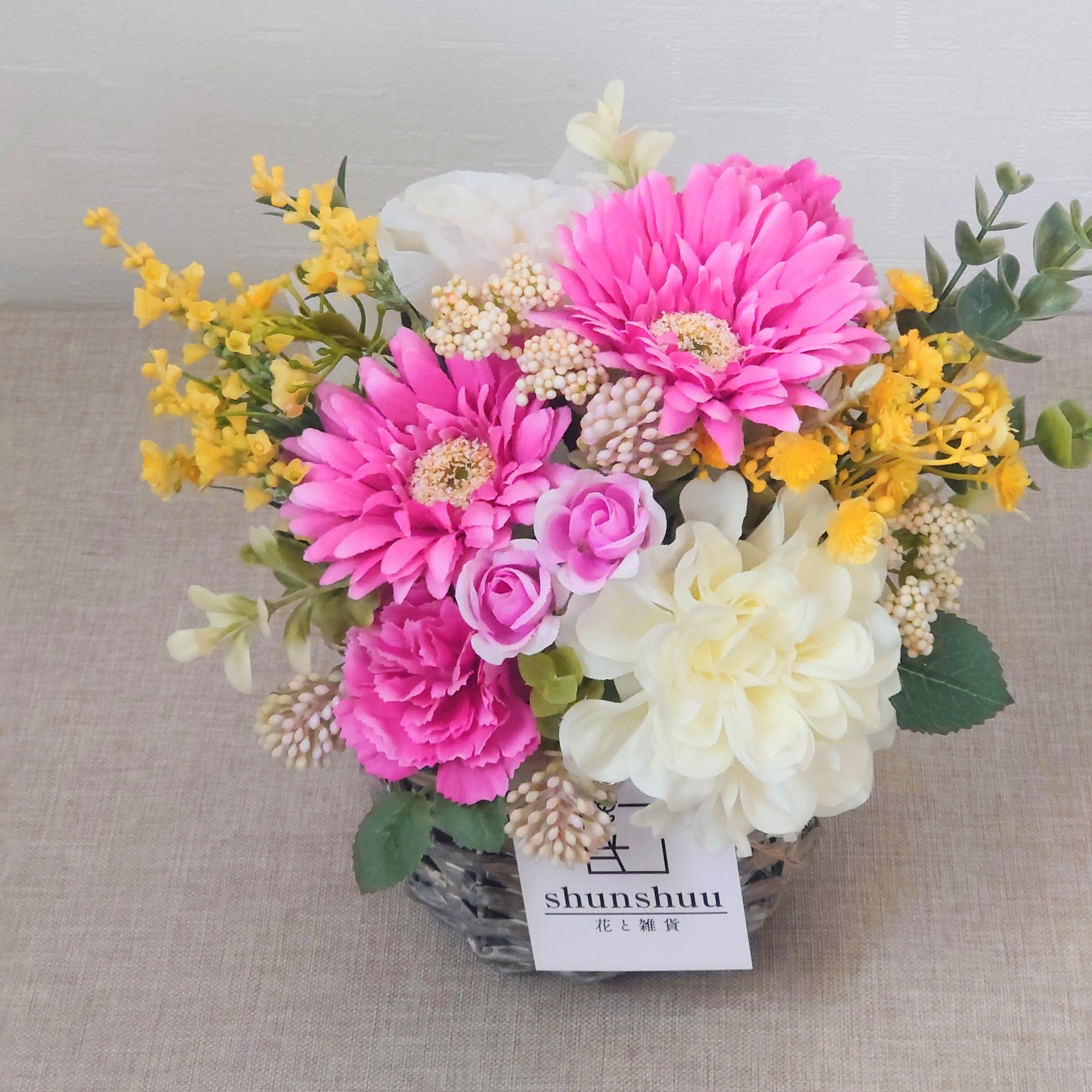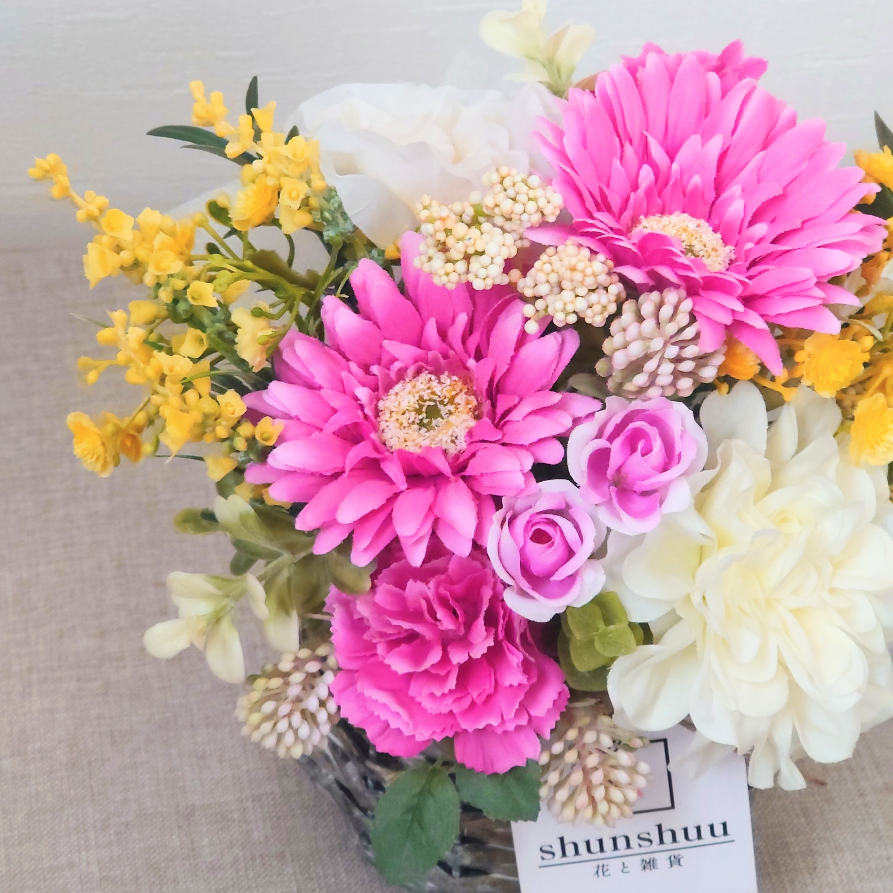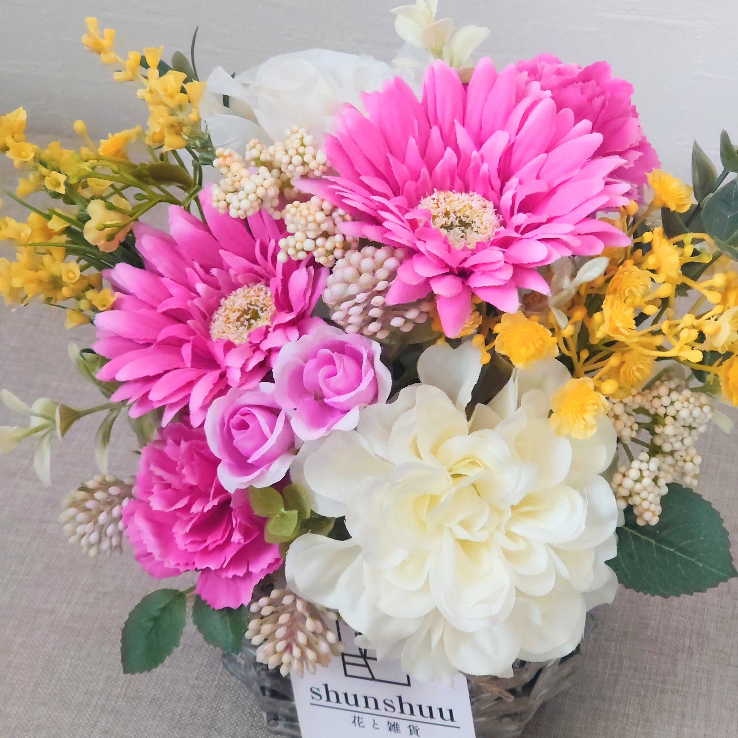 鮮やかなピンクの花々に、軽やかなイエローとやさしいホワイトを添えて、明るく元気な雰囲気に仕上げました。