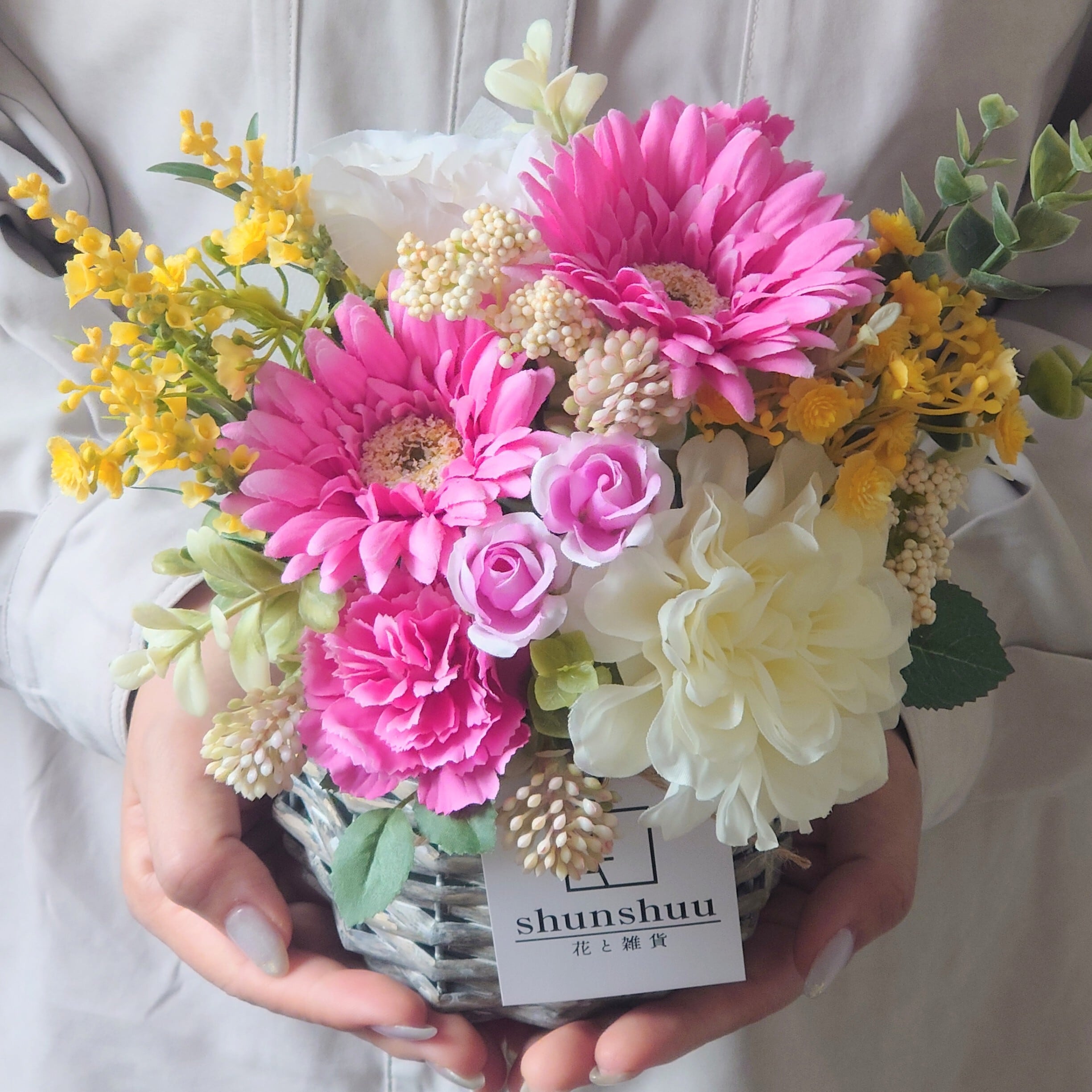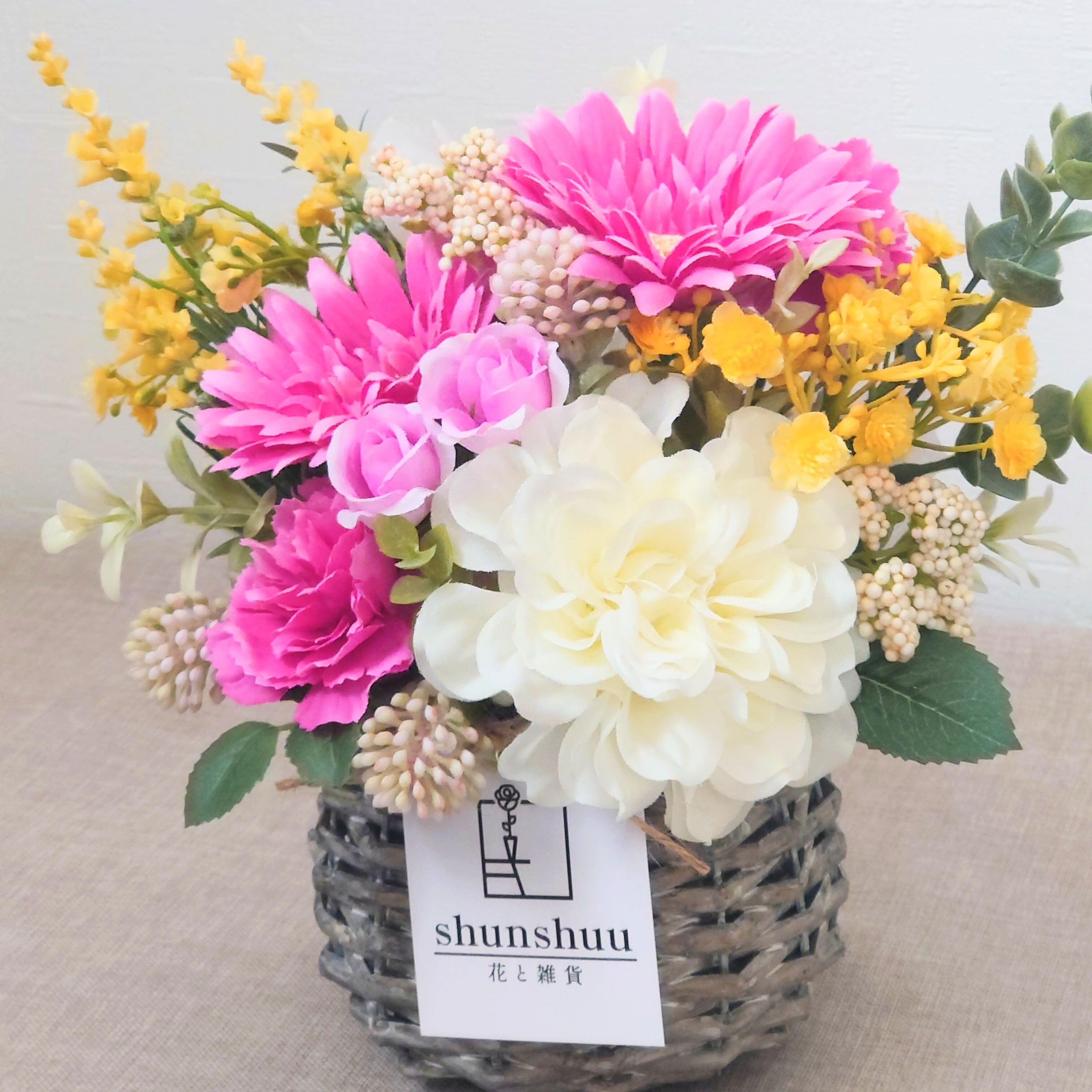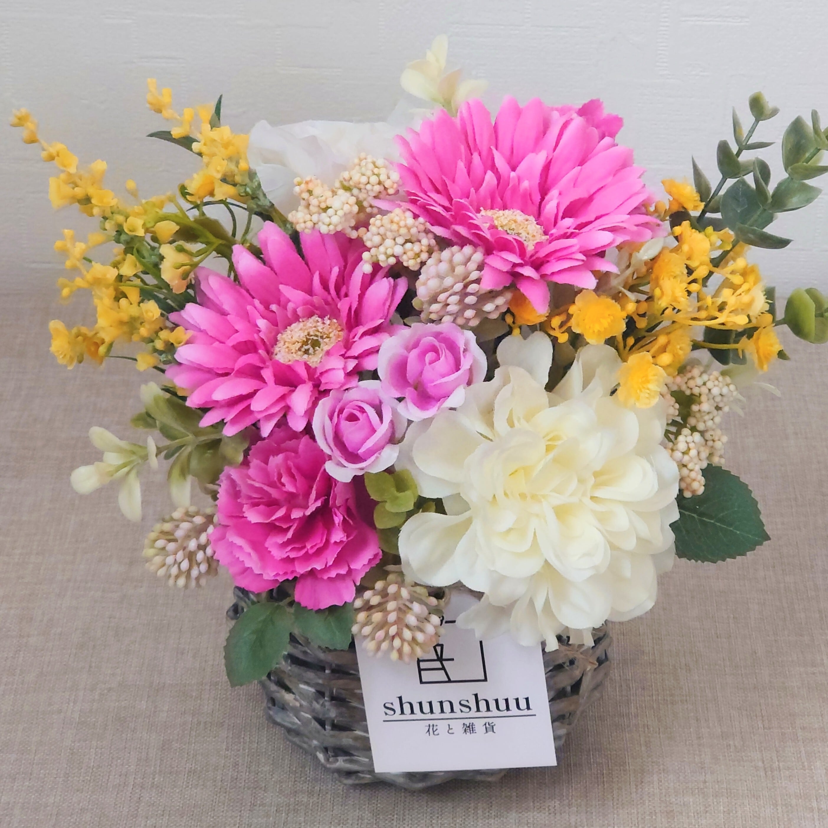 鮮やかなピンクの花々に、軽やかなイエローとやさしいホワイトを添えて、明るく元気な雰囲気に仕上げました。